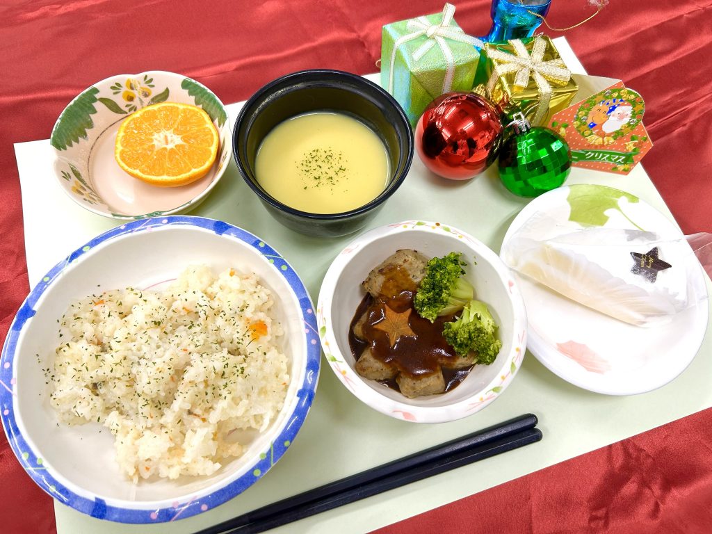 利用者様は、年に一度のクリスマスメニューを目でも楽しみ味わっていました。